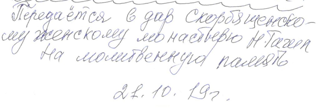 В этот день матушка Людмила Тимакова, супруга почившего 16 августа 2019 года митрофорного протоиерея Владимира Елисеева, настоятеля храма во имя праведного Иоанна Кронштадтского и преподобного Сергия Радонежского в г. Красноуральске, передала Скорбященскому женскому монастырю икону Божией Матери «Почаевская», принадлежавшую батюшке. Совсем недавно, 21 сентября, в праздник Рождества Пресвятой Богородицы, отмечалось 460 лет со дня принесения на Русь этого святого образа.